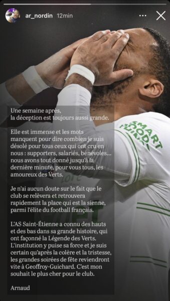 Après Denis Bouanga, c'est au tour d'Arnaud Nordin de sortir du silence et d'évoquer son sentiment après la descente du club en Ligue 2. Celui qui a terminé sa formation à l'ASSE évoque les efforts effectués pour éviter cette catastrophe pour le club et croit en des jours meilleurs. Un message sous forme d'au revoir puisque l'ailier stéphanois sera bientôt officialisé comme une recrue montpelliéraine.