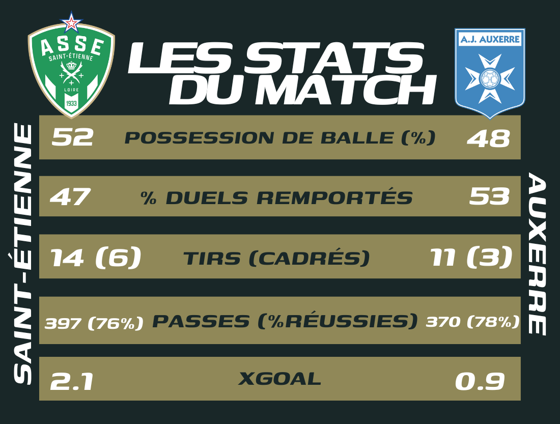 ASSE - AJA : Une victoire amplement méritée ? Posté par Romain Aublanc | Mar 11, 2024 | ASSE - Actualités L'AS Saint-Etienne est parvenu à faire chuter le leader auxerrois dans le Chaudron ce samedi. Une victoire enthousiasmante pour la suite de la saison. Retour en chiffres sur ASSE - AJA. ASSE - AJA en Statistiques Collectivement Focus individuels