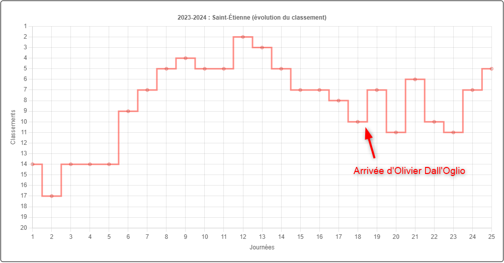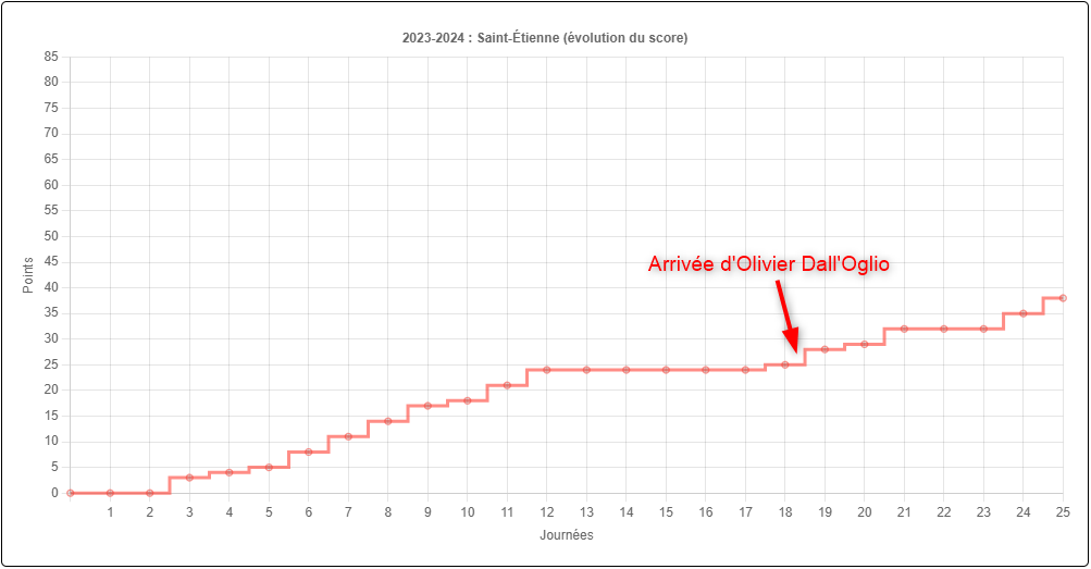 Depuis l'arrivée d'Olivier Dall'Oglio, l'ASSE peut compter sur une dynamique de résultats positive. Le site Football Fabien Torre permet d'apprécier les bénéfices de l'arrivée du nouveau coach des Verts d'un point de vue comptable et au classement.