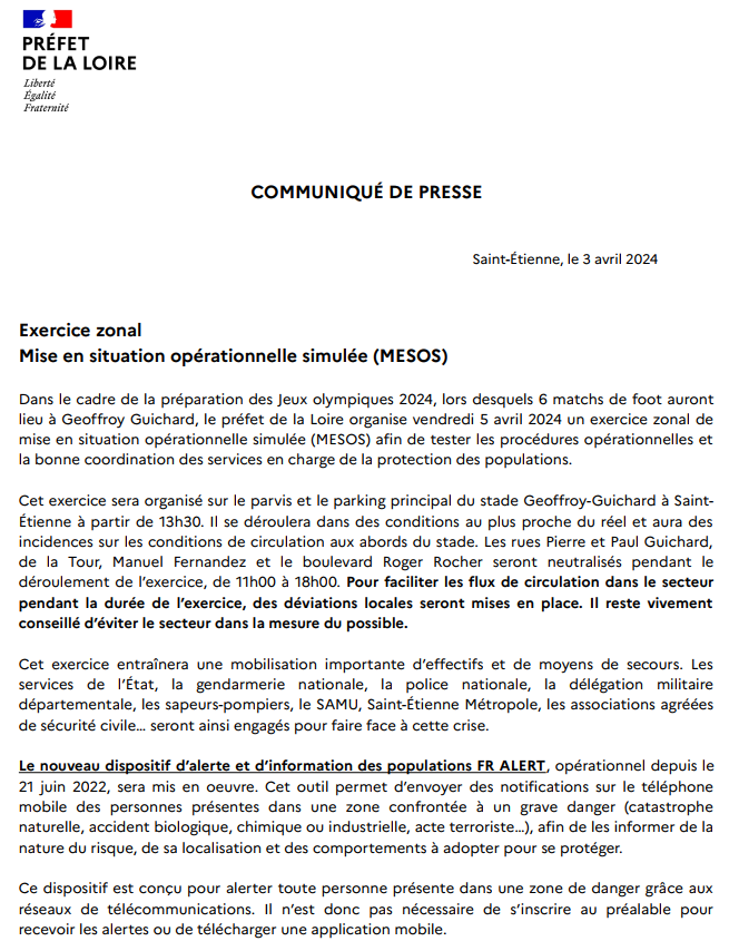 La préfecture de la Loire va profiter de l'occasion pour se mettre en ordre de marche avant les Jeux Olympiques qui arrivent à grands pas. Geoffroy-Guichard va accueillir six rencontres cet été. Il faudra être prêt à gérer les flux.