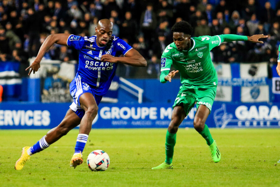 Kapit Djoco of Bastia and Lamine Fomba of Saint-Etienne during the Ligue 2 BKT match between Sporting Club Bastia and Association Sportive Saint-Etienne on January 31, 2023 in Bastia, France. (Photo by Xavier Grimaldi/Icon Sport)