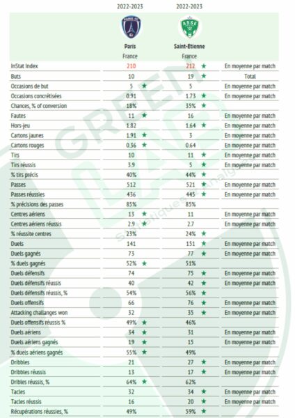 Les verts mènent au point en terme de statistiques. Pourtant le classement des franciliens est plus avantageux que celui des stéphanois (11e contre 18e). Les verts comptent 8 points (11 sans les 3 de pénalité) alors que les parisiens en ont 13. Des standards bien loin des attentes de début de saison pour les deux écuries.