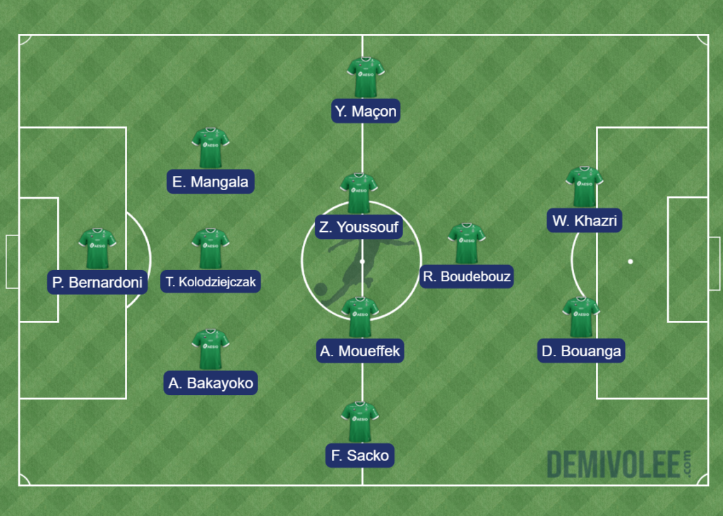 Devant, c'est le retour du meilleur buteur des verts : Wahbi Khazri. En effet, le tunisien devrait occuper le poste avec Denis Bouanga. En soutien Ryad Boudebouz sera présent pour animer le jeu stéphanois.