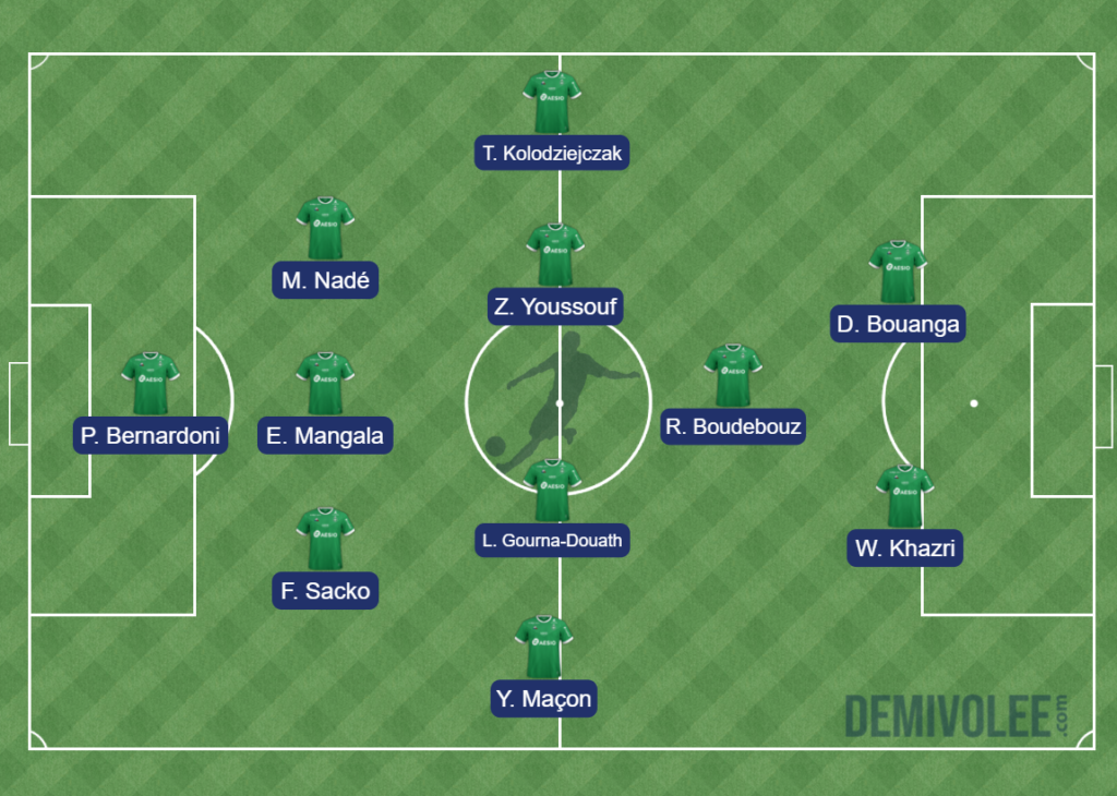 Devant, c'est Wahbi Khazri et Denis Bouanga qui devrait occuper les postes avec en soutien Ryad Boudebouz. Les 3 attaquants verts effectueront probablement un travail important pour que Hamouma, Nordin ou encore Thioub terminent le travail !