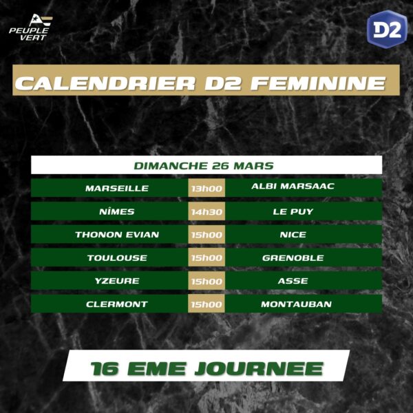 Comme vous le savez, l'unique équipe qui peut empêcher les Amazones de retrouver la première division est l'Olympique de Marseille. Les Marseillaises sont à cinq points de l'ASSE, mais il reste toujours une confrontation entre les deux équipes. Lors de leur dernier match, elles se sont imposées 3-0 en déplacement contre Montauban. Ce week-end, elles seront confrontées à l'équipe d'Albi Marsac, qui se situe juste devant Yzeure au classement.