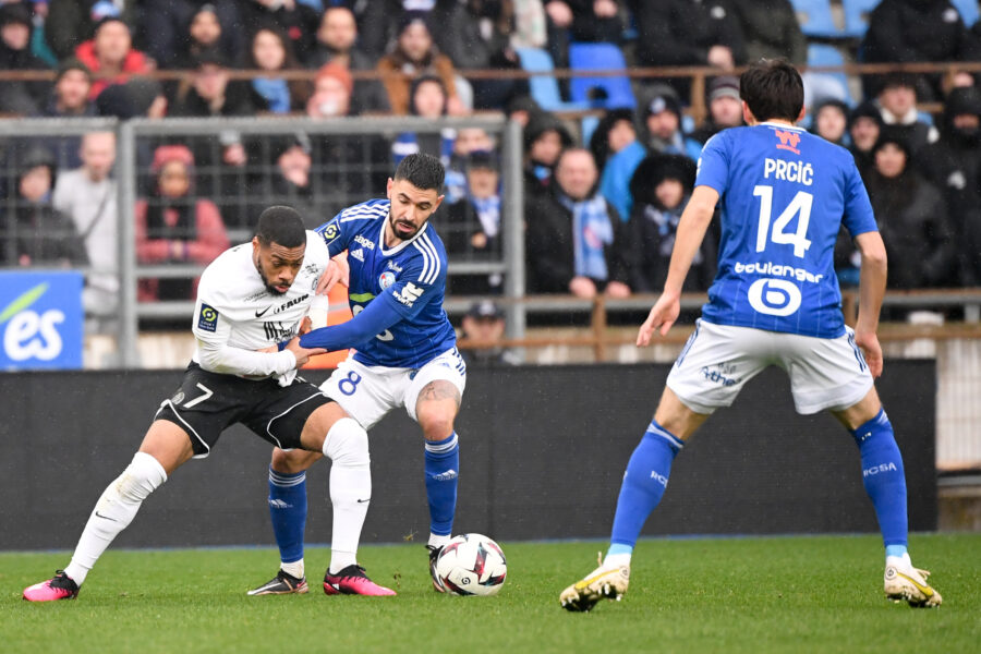 07 Arnaud NORDIN (mhsc) - 08 Morgan SANSON (rcsa) during the Ligue 1 Uber Eats match between Strasbourg and Montpellier at Stade de la Meinau on February 5, 2023 in Strasbourg, France. (Photo by Anthony Bibard/FEP/Icon Sport)