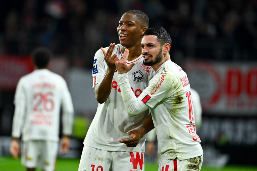 Remy CABELLA of Lille celebrates his goal with Bafode DIAKITE of Lille during the Ligue 1 Uber Eats match between Rennes and Lille at Roazhon Park on February 4, 2023 in Rennes, France. (Photo by Anthony Dibon/Icon Sport)