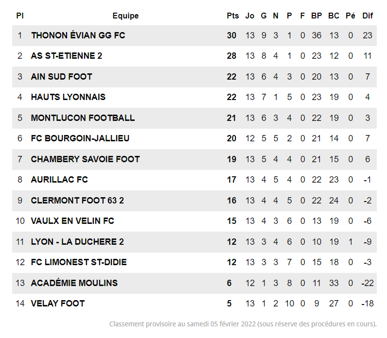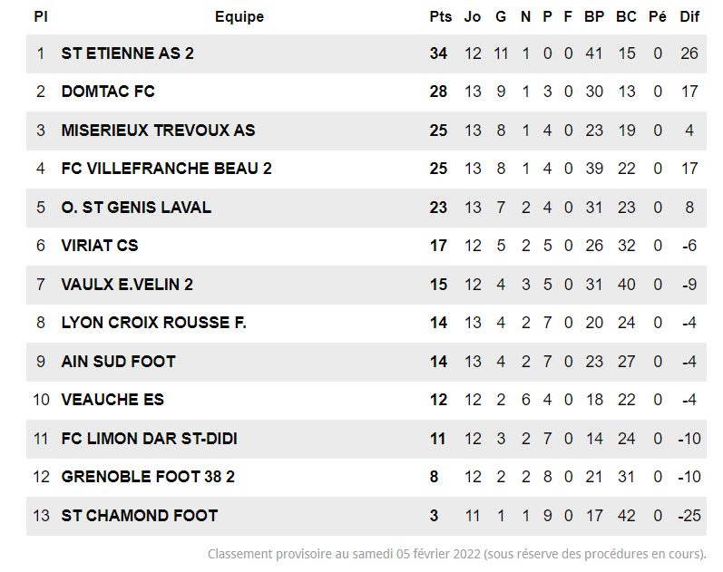 L'équipe de Razik Nedder est clairement dans la lutte pour l'accession à l'étage supérieur. La mission s'annonce difficile car Thonon-Evian (ex-pensionnaire de ligue 1) dispose de moyens très importants pour monter en national 2. Le match du 26 février à Thonon promet de tenir toutes ses promesses ! Avant cela, les verts devront bien gérer la réception de Bourgoin-Jallieux ce week-end, seule équipe de la poule à les avoir battu !