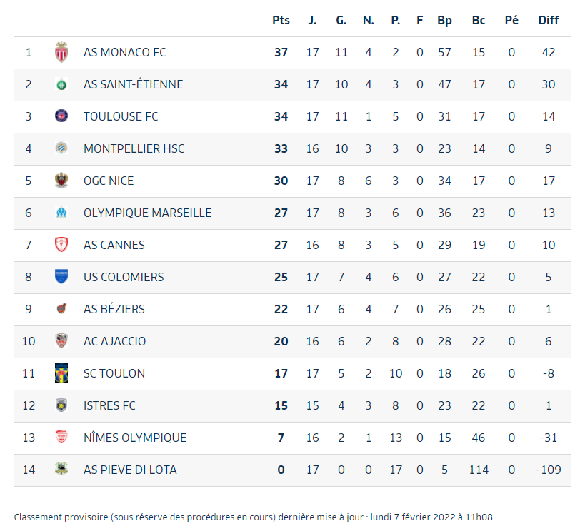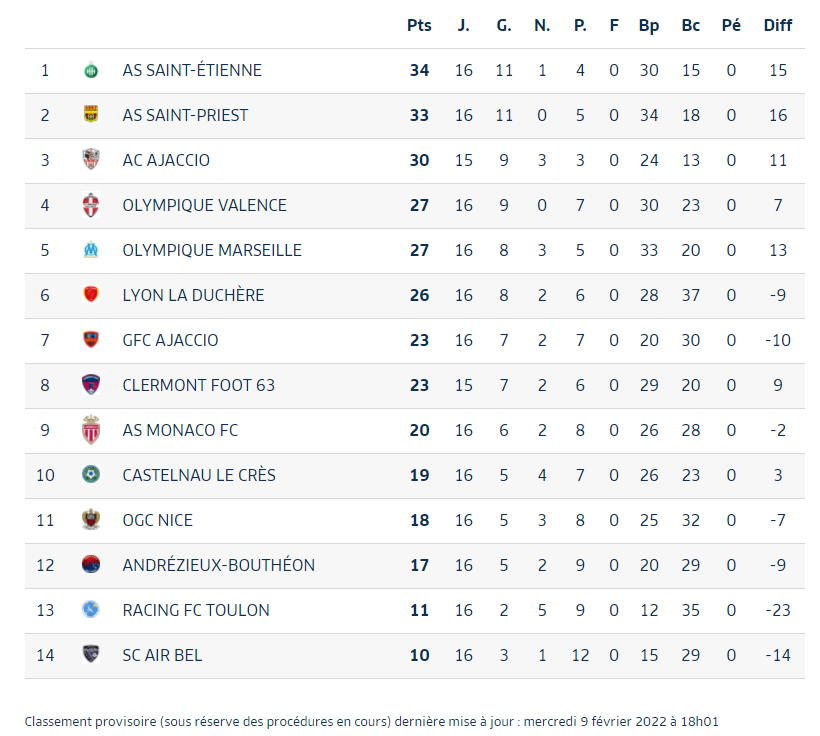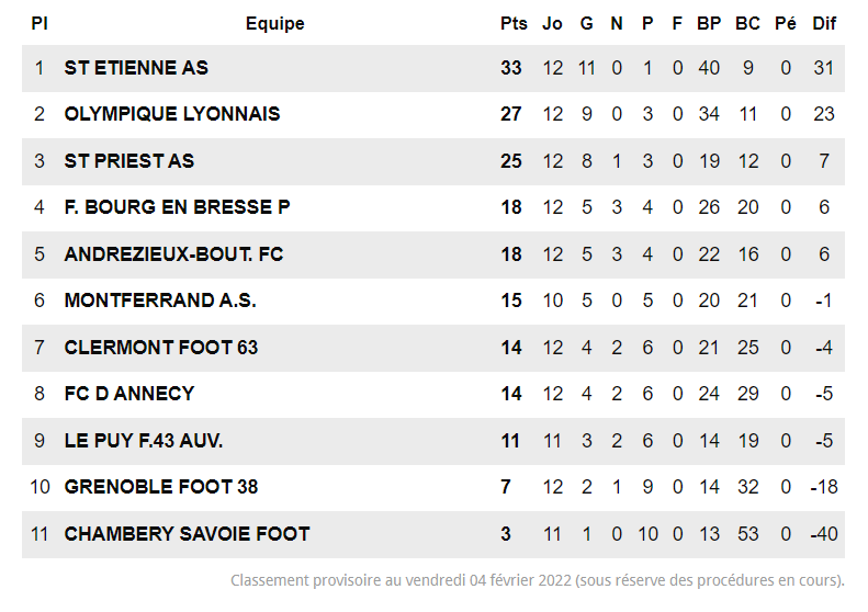 Le championnat se jouera probablement à 3 pour accéder aux play-offs. Les verts sont pour le moment en tête grâce à leur victoire du week-end contre Saint-Priest. Cependant, il reste sous la menace de Saint Priest et Ajaccio qui seront profiter du moindre faux pas. Une fin de saison qui s'annonce passionnante !
