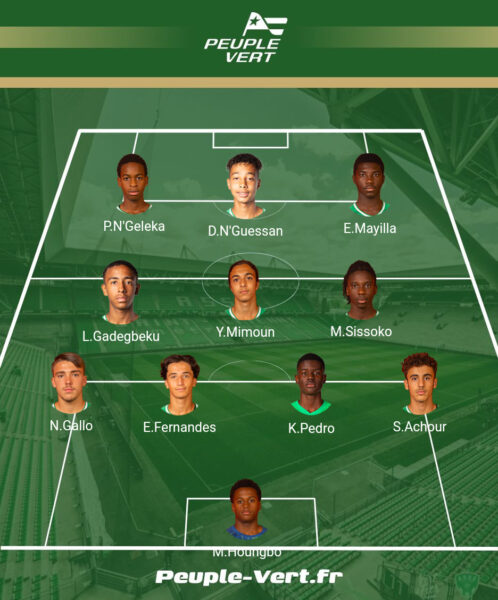 Le match commence de la plus belle des manières. Sur un bon travail de Gadegbeku, Noan Gallo est trouvé côté gauche et délivre un délice de centre que Ngeleka pousse de la tête au 2e poteau. 1à0 pour les Verts après 3 minutes de jeu ! À la 20e minute, Enzo Mayilla va inscrire le second but de la rencontre. Sur une série de dribbles exceptionnelle où il élimine pas moins de 4 joueurs, Le numéro 11 stéphanois finit plat du pied droit avec sang-froid. Magistral ! 2-0