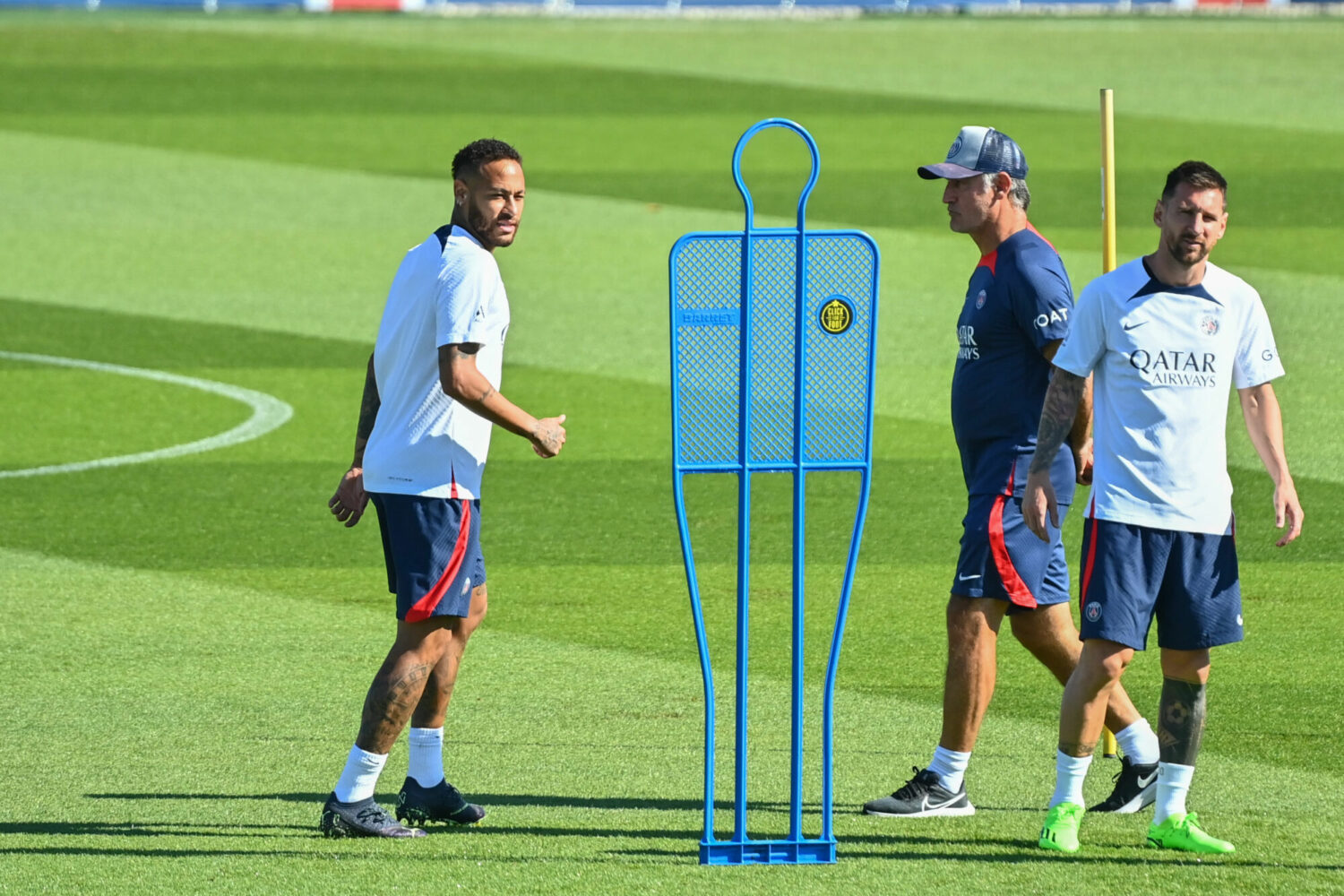 NEYMAR JR of PSG, Christophe GALTIER head coach of PSG and Lionel MESSI of PSG during the training session of Paris Saint Germain on August 11, 2022 at Camp des Loges in Saint Germain en Laye, France. (Photo by Anthony Dibon/Icon Sport)