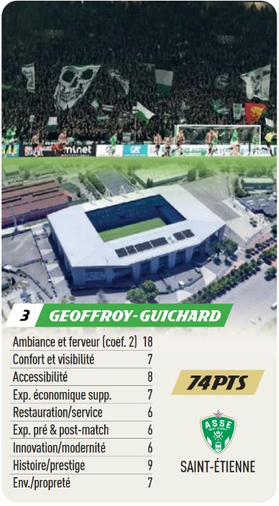 Selon un classement réalisé par L’Équipe, Geoffroy-Guichard figure parmi les trois meilleures enceintes de Ligue 1. Avec un score de 74 points, le Chaudron devance des stades modernes comme Lille ou Nice et s’installe sur la troisième marche du podium, juste derrière le Vélodrome (76 pts) et le Parc des Princes (75 pts).
