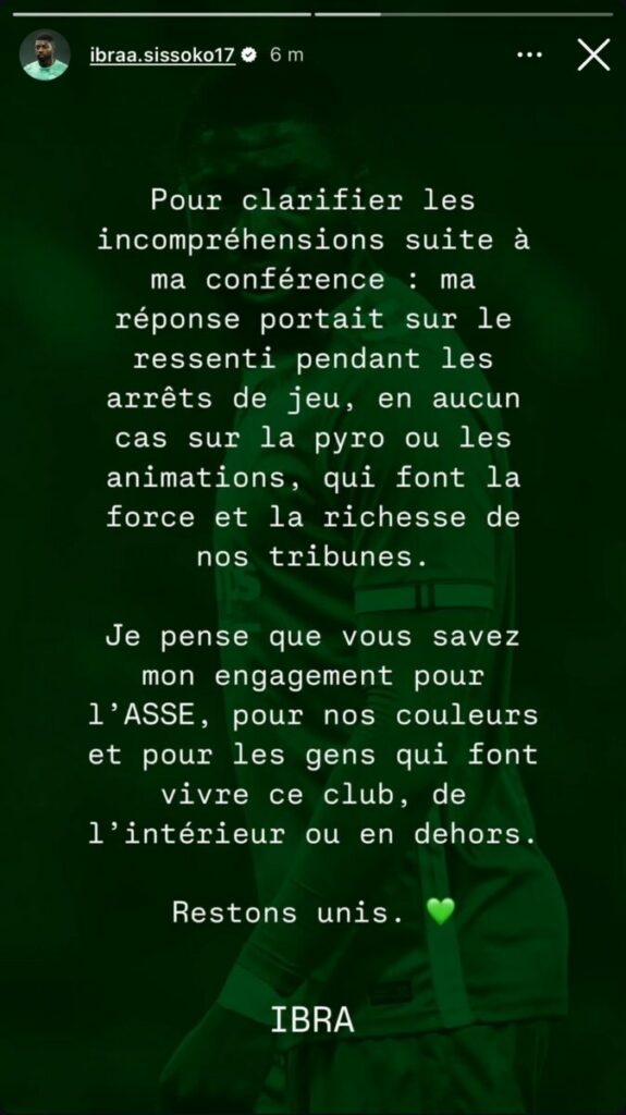 Via une story Instagram, le joueur déclare : "Pour clarifier les incompréhensions suite à ma conférence : ma réponse portait sur le ressenti pendant les arrêts de jeu, en aucun cas sur la pyro ou les animations, qui font la force et la richesse de nos tribunes. Je pense que vous savez mon engagement pour l'ASSE, pour nos couleurs et pour les gens qui font vivre ce club, de l'intérieur ou en dehors. Restons unis."