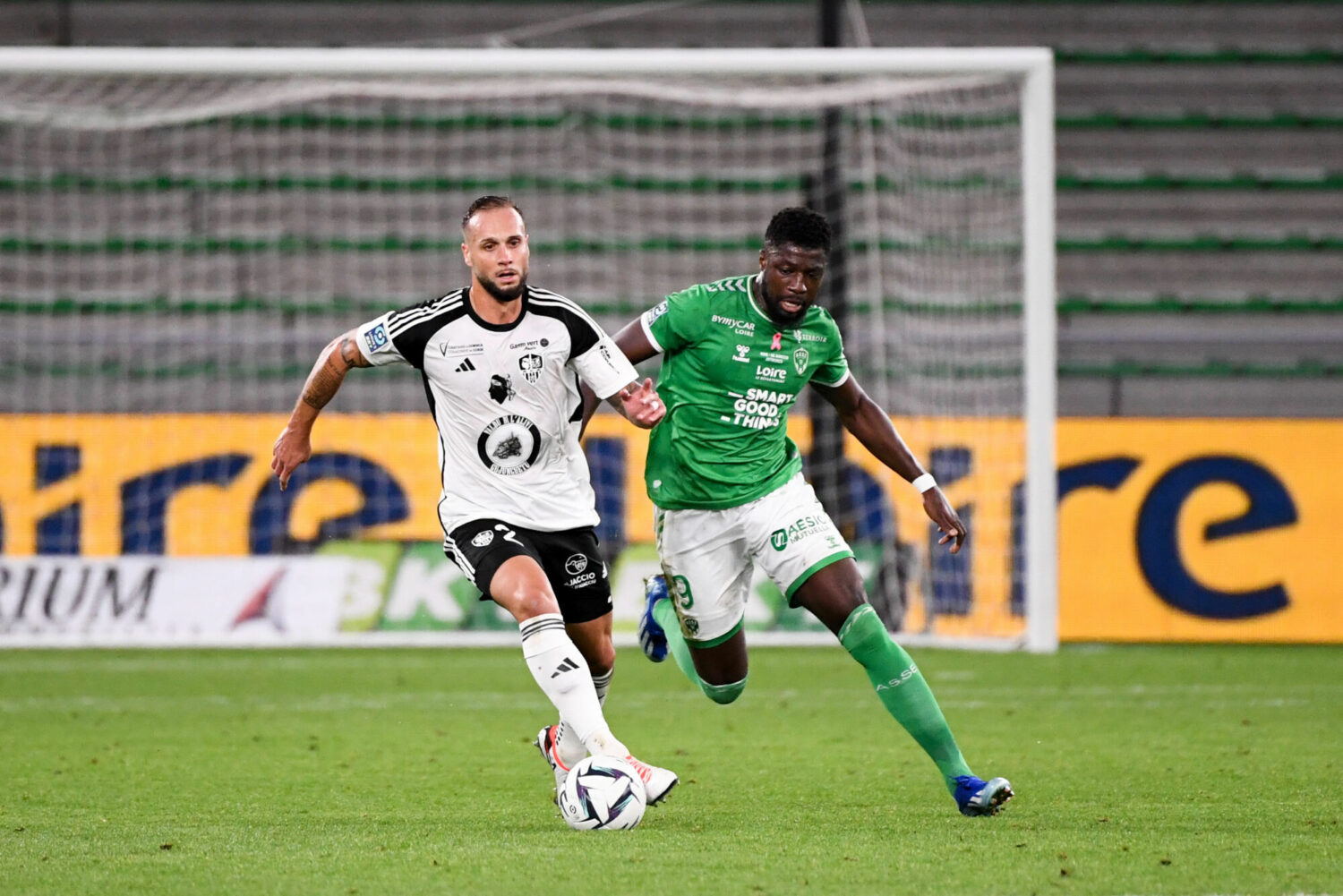 02 Maxime CHANOT (aca) - 09 Ibrahim SISSOKO (asse) during the Ligue 2 BKT match between Association Sportive de Saint-Etienne and Athletic Club Ajaccien at Stade Geoffroy-Guichard on October 7, 2023 in Saint-Etienne, France. (Photo by Anthony Bibard/FEP/Icon Sport)