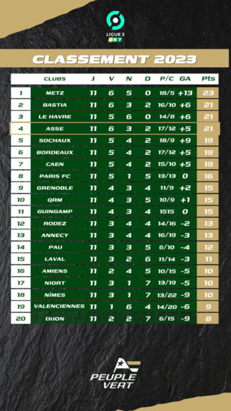 Notons que parmi les 9 équipes à la lutte pour le maintien en Ligue 2, l'AS Saint-Etienne présente la meilleure dynamique, et de loin, sur cette année 2023. Pour autant, les Verts restent à deux petites longueurs de la zone de relégation. Il est bien trop tôt pour souffler du côté des Stéphanois.
