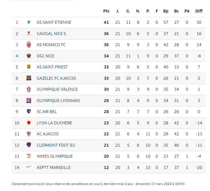 Les U17 ont grillé une cartouche dans cette fin de saison. Au niveau des résultats des concurrents, Monaco a ramené un point d'Ajaccio (0-0). L'OGC Nice a lui été défait à la maison contre Air Bel (0-1). Le Cavigal Nice a été tenu en échec 2-2 contre Nîmes. Voici le point sur le classement à l'issue de la 21ᵉ journée.