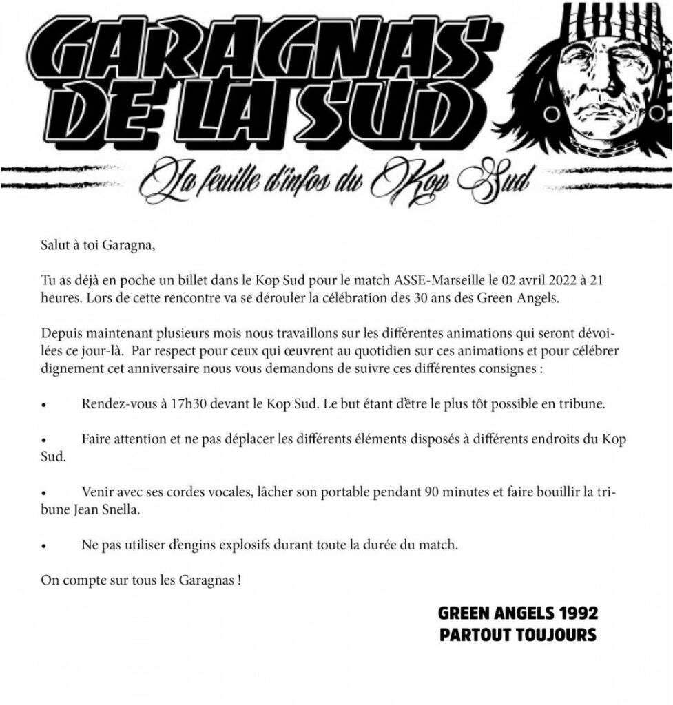 Pour le compte de la 30Ăšme journĂ©e de ligue 1, l'AS Saint-Etienne reçoit l'Olympique de Marseille. MalgrĂ© une tempĂ©rature qui s'annonce extrĂȘmement faible, le chaudron qui promet d'ĂȘtre bouillant ! En effet, le groupe de supporters "Les Greens Angels" fĂȘtent leur 30 ans. CrĂ©e en 1992, le groupe va fĂȘter sa trentaine dans un stade Ă guichets fermĂ©s.