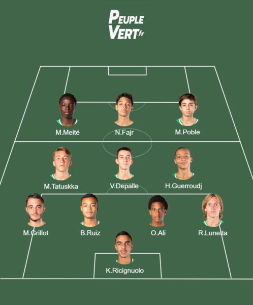 Probablement vexés par le résultat de la semaine passée, les U16 ont eu une belle réaction. C'est Guerroudj qui dribble dans la surface et se fait crocheter. Penalty pour l'ASSE, Maysson Meité (en photo avec son numéro 11) le transforme ! Ce même Guerroudj va doubler la mise. À la réception d'un centre venu de la droite, il termine du pied gauche en croisant sa frappe. El Jamali, de retour après un début de saison gâchée par une blessure, va inscrire son premier but sous le maillot stéphanois. Suite à un cafouillage, il va enrouler du pied gauche et voir sa frappe prendre la lucarne ! 3-0 pour les verts qui dominent vraiment les débats !
