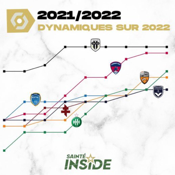 Nos camarades de Sainté Inside ont publié un graphique très intéressant. Ce dernier montre la dynamique des clubs luttant pour le maintien depuis le début de l'année 2022. Deux clubs sortent leur épingle du jeu : Clermont Foot 63 et... St-Etienne !