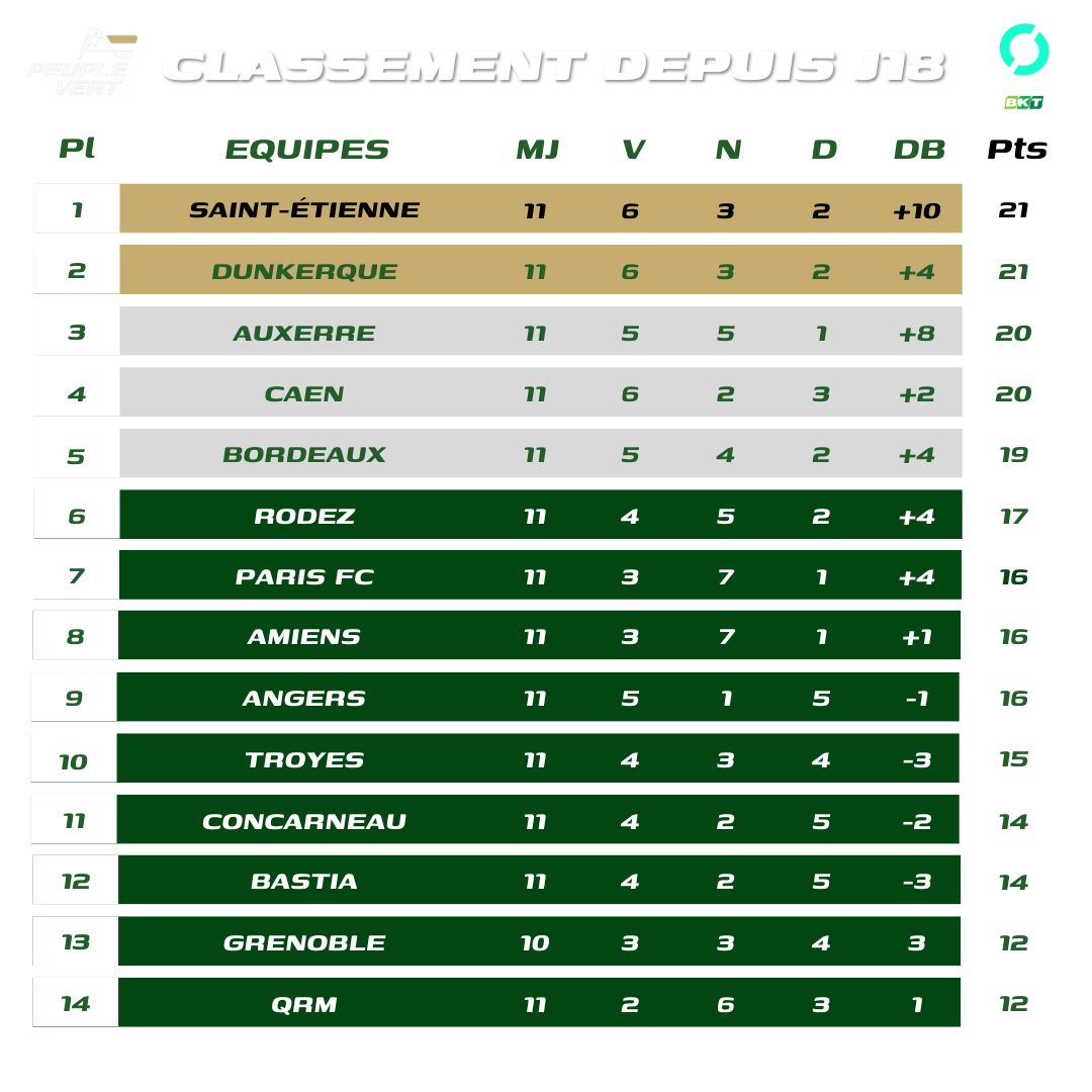 Un classement qui permet de mettre en évidence la baisse de régime d'Angers, qui ne collecte que 16 points lors des 11 derniers matches de championnat, et de Laval qui n'en marque que 13 avant sa rencontre de ce soir face à Grenoble.