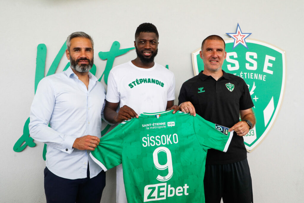 Ibrahima SISSOKO of Saint Etienne and Laurent BATLLES coach of Saint Etienne and Loic PERRIN Sport Director of Saint Etienne during the press conference of AS Saint-Etienne on July 10, 2023 in Saint-Etienne, France. (Photo by Romain Biard/Icon Sport)