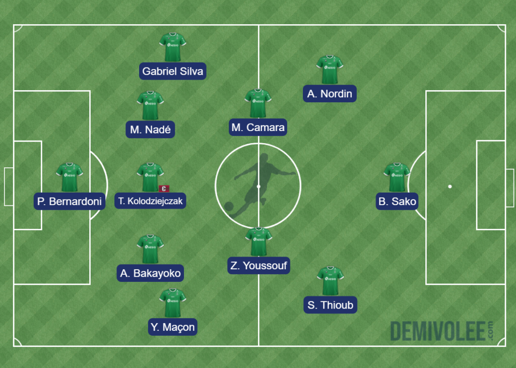 Sur les ailes, Thioub sera probablement titulaire avec Nordin malgré le bon match d'Aouchiche contre Lens. Les verts vont probablement vouloir de la vitesse pour contrer les lyonnais.