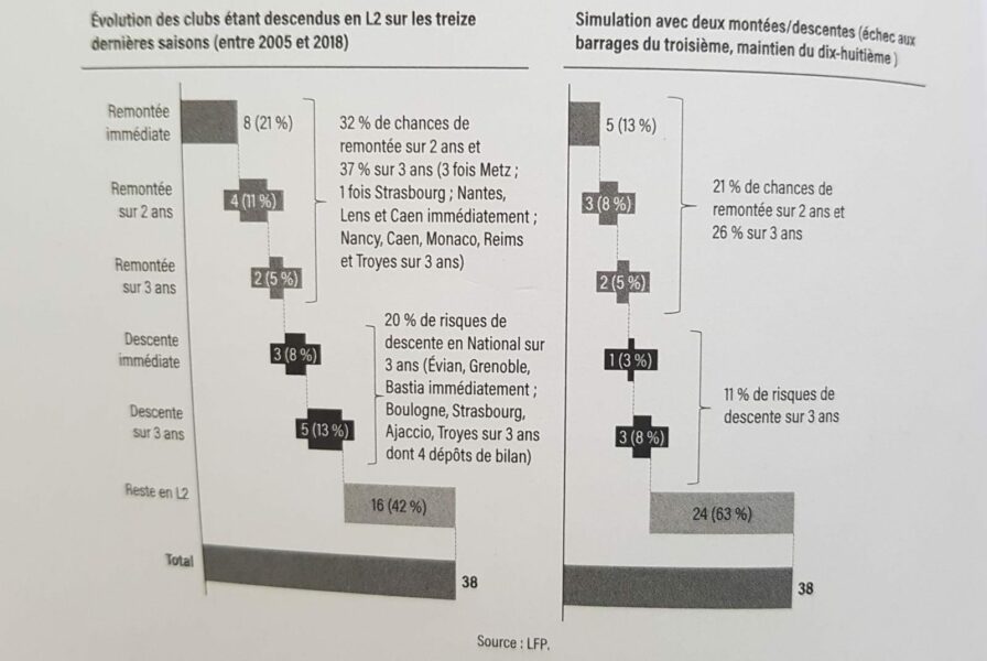 Nous nous sommes penchés sur les faits du 21e siècle. Nous avons comparé sur 21 saisons combien de fois les clubs réussissaient à remonter immédiatement. Le constat est le suivant : 11 clubs remontent directement après une relégation sur 57 clubs relégués sur le 21e siècle c'est à dire un peu plus de 19 %. Aussi, depuis 2010, seulement 3 clubs sur 29 ont réussi à remonter soit à peine plus de 10 %.