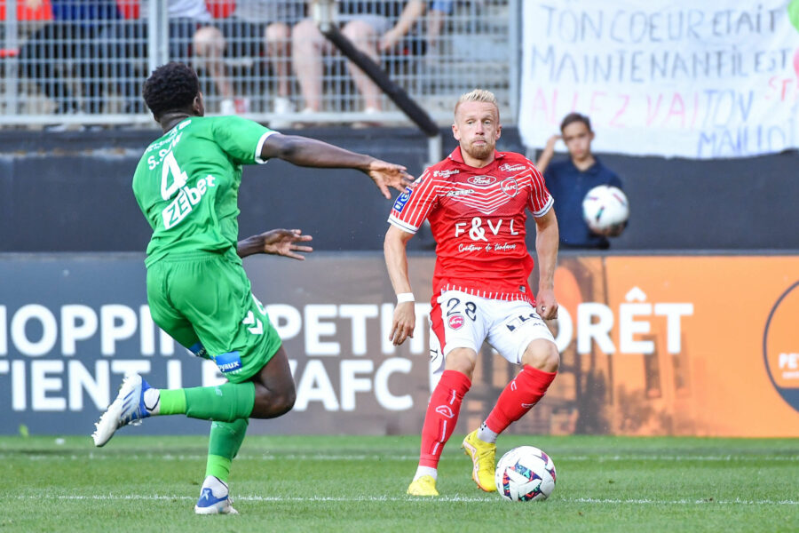 Quentin LECOEUCHE of Valenciennes and Saidou SOW of Saint Etienne during the Ligue 2 BKT match between Valenciennes and Saint Etienne at Stade du Hainaut on August 27, 2022 in Valenciennes, France. (Photo by Franco Arland/Icon Sport)