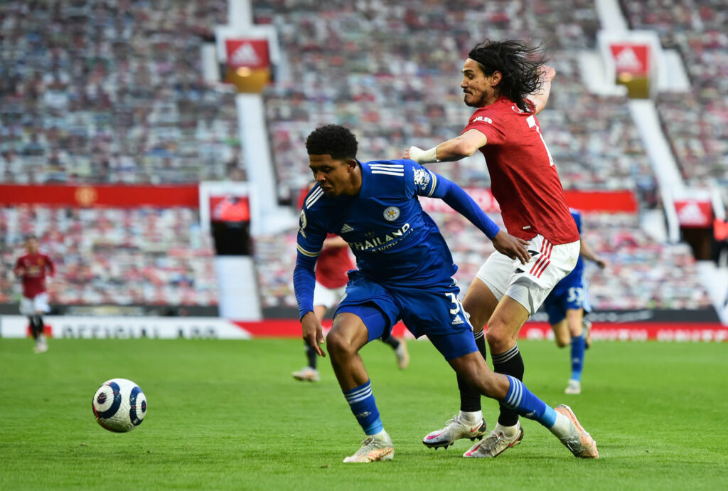 Leicester City's Wesley Fofana and Manchester United's Edinson Cavani (right) battle for the ball during the Premier League match at Old Trafford, Manchester. Picture date: Tuesday May 11, 2021.