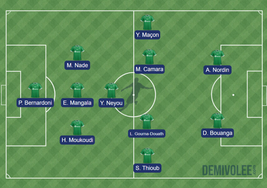 En terme de forme du moment, ce sont les deux joueurs les plus affutés qui commenceront. En effet, Denis Bouanga est dans une belle forme, tout comme Arnaud Nordin qui réalise de bien meilleures prestations ces derniers temps. Les deux joueurs seront voués à l'exploit dans un match où les verts risquent de courir après le ballon. Le choix de mettre deux bons contre-attaquants peut s'avérer être une bonne idée. Quoi qu'il en soit Dupraz n'en a pas tellement d'autres !