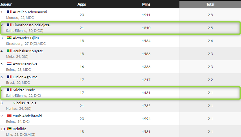 Mickaël Nadé n'est pas le défenseur central le plus esthète de notre Ligue 1, il s'avère qu'il est toutefois l'un des plus efficaces. Deuxième au classement des duels remportés (64,8%) juste derrière Aurélien Tchouaméni (66%), il se construit une réputation de défenseur dur sur l'homme et efficace. Nous avons voulu en savoir un peu plus sur ses performances et sommes allés chercher le classement des interceptions réussies en Ligue 1 pour des joueurs ayant disputé 15 rencontres au minimum. Là encore, Mickaël Nadé apparaît dans le top 10 puisqu'il est 7ème avec 2,1 interception réussie par rencontre. Un autre stéphanois devance toutefois le jeune défenseur central puisqu'il s'agit de Timothée Kolodziejczak (2,5 interceptions) souvent raillé pour sa maladresse. De quoi le réhabiliter chez les supporters, lui qui a inscrit le but victorieux des Verts dimanche dernier face à Clermont-Ferrand.