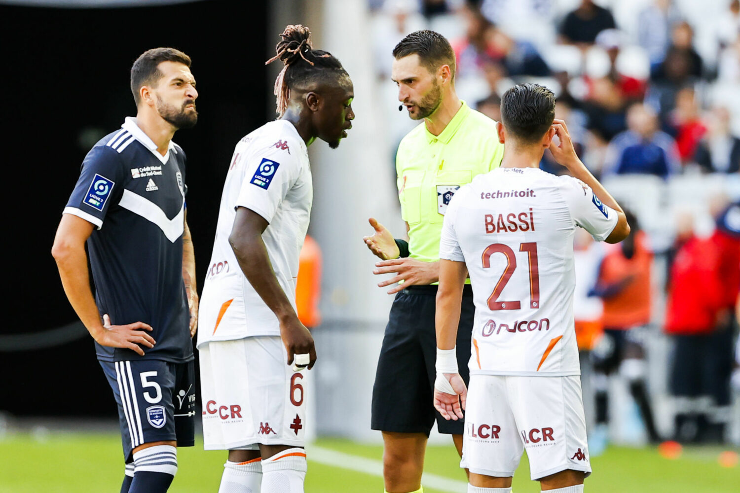 05 Yoann BARBET (fcgb) - 06 Kevin N'DORAM (fcm) - Pierre LEGAT (arbitre) during the Ligue 2 BKT match between Bordeaux and Metz at Stade Matmut Atlantique on October 8, 2022 in Bordeaux, France. (Photo by Romain Perrocheau/FEP/Icon Sport) - Photo by Icon sport