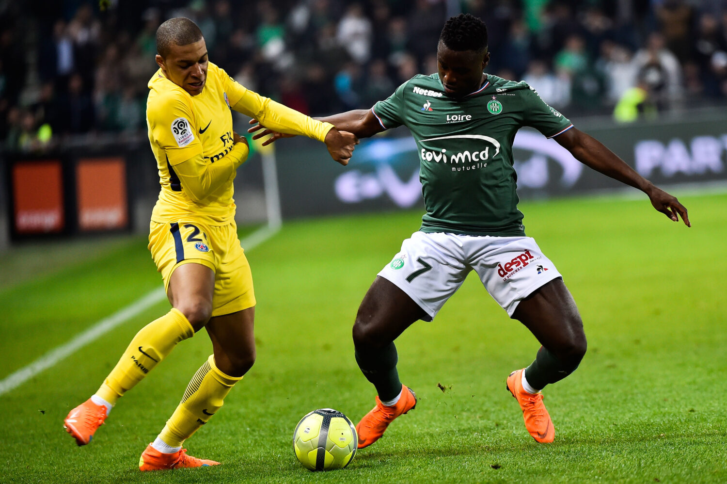Kylian Mbappe of Paris and Paul George Ntep of Saint Etienne during the Ligue 1 match between AS Saint-Etienne and Paris Saint Germain at Stade Geoffroy-Guichard on April 6, 2018 in Saint-Etienne, . (Photo by Romain Lafabregue/Icon Sport)