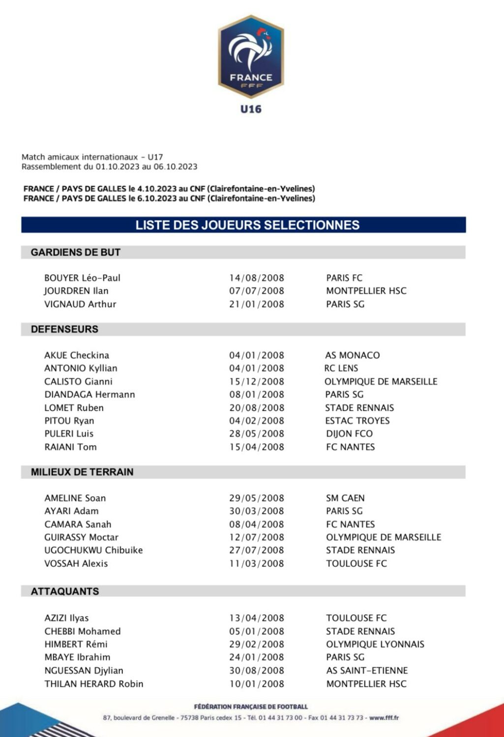 La génération 2008 va donc se rassembler pour une double confrontation contre le Pays de Galles. En effet, les 23 joueurs de Lionel Rouxel seront ensemble du 1e au 6 octobre prochain pour un rassemblement de début de saison. Ils joueront le 4 et le 6 octobre à Clairefontaine.
