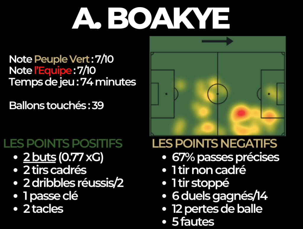 Aligné sur l’aile droite face à Reims, Augustine Boakye a marqué les esprits en inscrivant ses deux premiers buts sous le maillot stéphanois. En 74 minutes de jeu, le Ghanéen a brillé par son activité et sa justesse, devenant un élément clé des offensives des Verts. Une performance attendue depuis son arrivée l’été dernier en provenance d’Autriche.