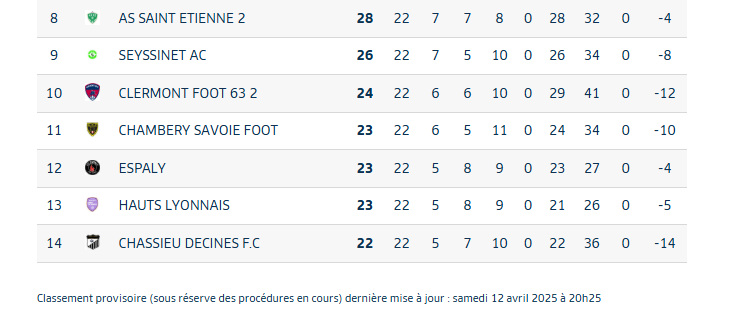 Dans cette course folle au maintien, les stéphanois sont à la lutte avec 6 autres écuries. Saint-Etienne (8e avec 27 points), Espaly (9e avec 23 points), Seyssinet (10e avec 23 points), Chambéry (11e avec 22 points), Hauts Lyonnais (12e avec 22 points), Clermont (13e avec 21 points) et Chassieu Décines (14e avec 21 points). Les quatre derniers à l'issue des 26 journées seront relégués en régional 1.