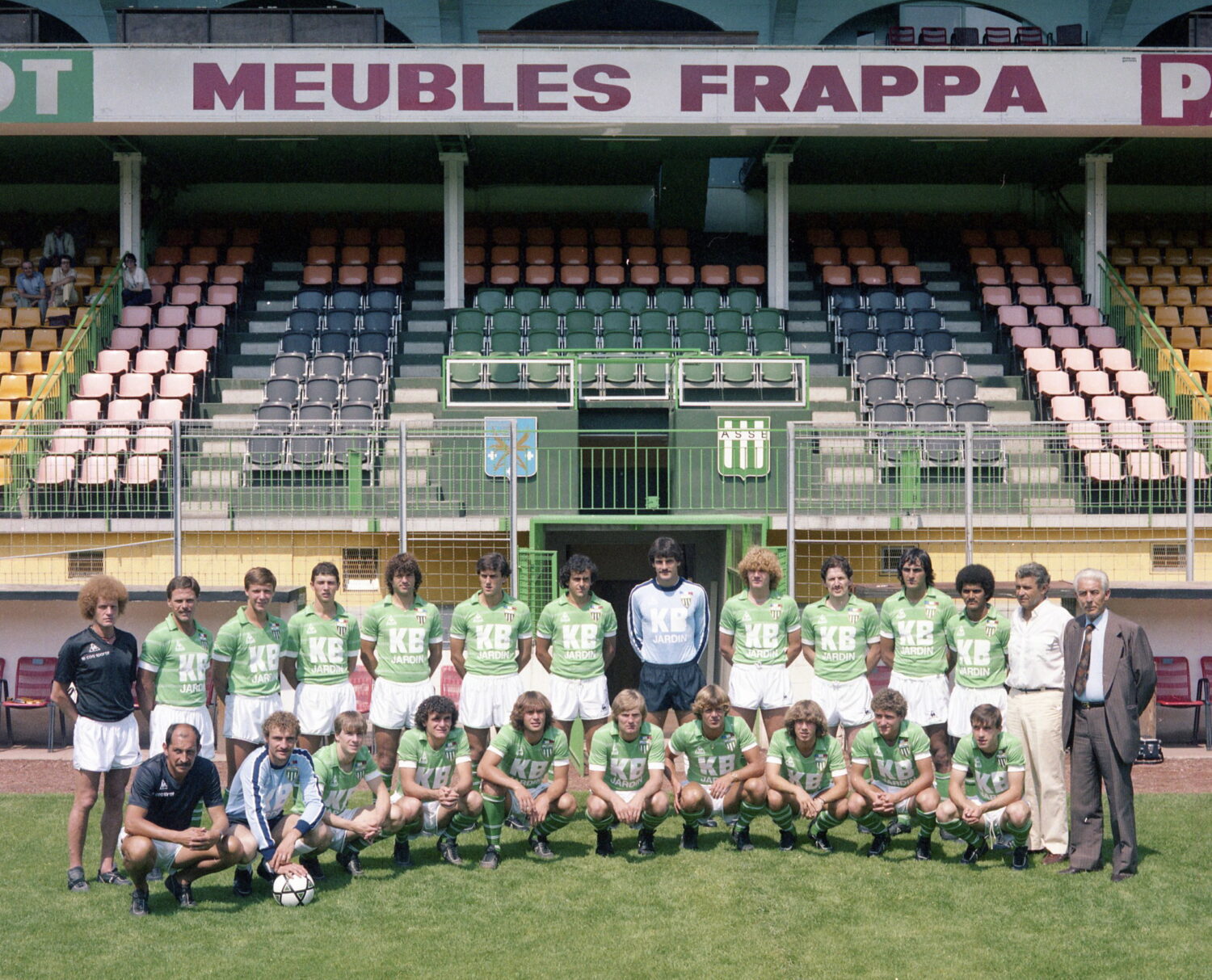 August 1981 at Stade Geoffroy Guichard in Saint Etienne. Team As Saint Etienne . Debout de g ‡ d: Robert Herbin, Christian Lopez, Thierry Oleksiak, Yves Colleu, Jacques Santini, Patrick Battiston,Michel Platini,Jean Castaneda,Philippe Millot,Bernard Gardon, Jean FranÁois Larios, Gerard Janvion, Pierre Garonnaire, Roger Rocher. Accroupis: Guy Briet,Eric Solignac, Patrick Lestage, Jean Louis Zanon, Laurent Roussey, Benny Nielsen, Johnny Rep, Laurent Paganelli, Eric Bellus, Thierry Wolff. Photo by Jean Michel Bancet / Icon Sport. - Photo by Icon Sport