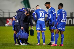 Jimmy GIRAUDON of Troyes Florian TARDIEU of Troyes Yoann SALMIER of Troyes and Lenny PINTOR of Troyes during the Ligue 2 BKT round match between Pau and Troyes on January 23, 2021 in Pau, France. (Photo by Pierre Costabadie/Icon Sport)