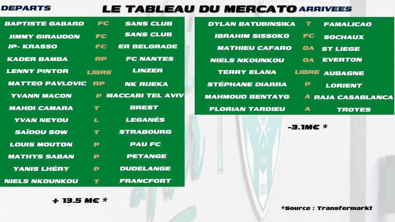 En plus de Niels Nkounkou transféré à Francfort (7M€+3.5M€ de bonus), l'ASSE a enregistré les départs de Mathys Saban et Yanis Lhéry, la veille. Les deux joueurs sont sous contrat jusqu'en 2025 avec leur club qui a décidé de les prêter au Luxembourg. FC Progrès Niederkorn pour Yanis Lhéry et Union Titus Pétange pour Mathys Saban. L'ASSE aura ainsi pu réduire une partie de son effectif pendant ces 80 jours de mercato et ne compte donc plus que 35 contrats professionnels.