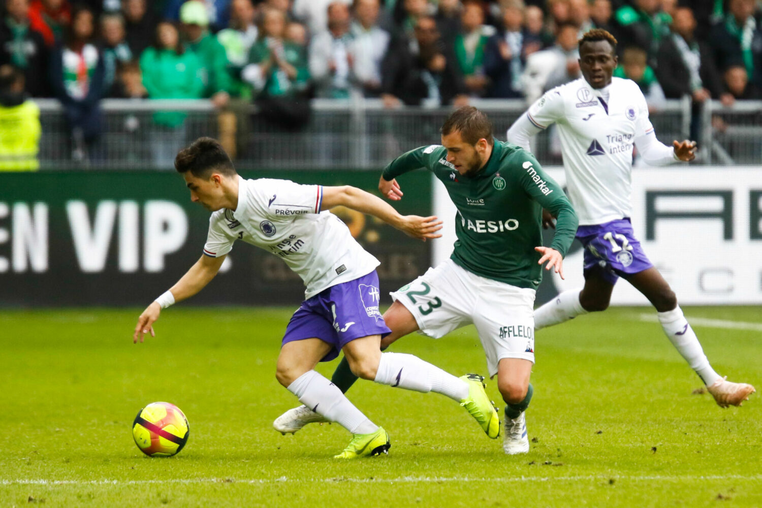 Garcia Alonso Manuel of Toulouse and Vada Valentin of Saint Etienne during the Ligue 1 match between Saint Etienne and Toulouse at Stade Geoffroy-Guichard on April 28, 2019 in Saint-Etienne, France. (Photo by Romain Biard/Icon Sport)